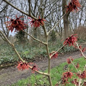 Im kalten trüben Winter, erfreut die Zaubernuss und trotzt der Witterung.
