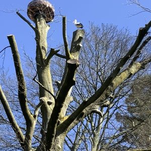 Lautes Klappern auf der Blutbuche. In jedem Fall findet unser Storchennest Beachtung. Aber es fehlt vielleicht das Paar?