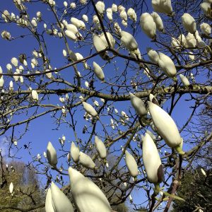 Eine Frostnacht und der rosa- weiße Blütenrausch der blühenden Magnolien ist dahin. Diese weiße Tulpenmagnolie, Magnolia soul.Lennie alba hat Glück gehabt und erfreut uns umso mehr