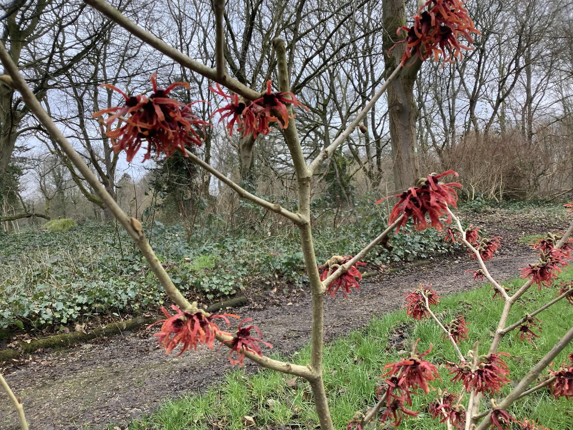 Im kalten trüben Winter, erfreut die Zaubernuss und trotzt der Witterung.