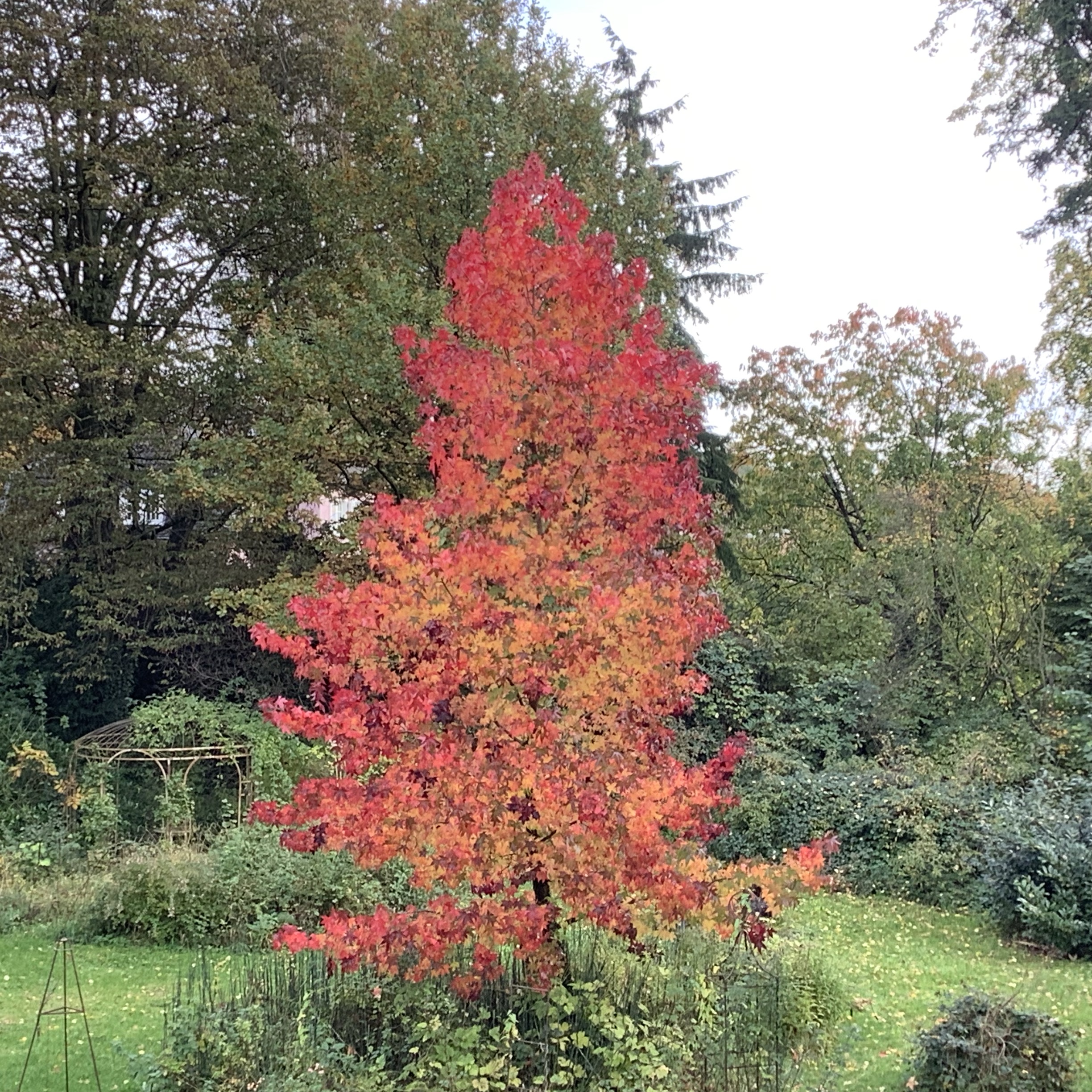 Dieser leuchtende Amberbaum, direkt aus unserem Küchenfenster zu sehen, ist ein Star unter den Herbstfärbern. Ein paar Tage noch, dann wird der Wind auch die letzten Blätter heruntergeholt haben. Aber der nächste Herbst kommt bestimmt.