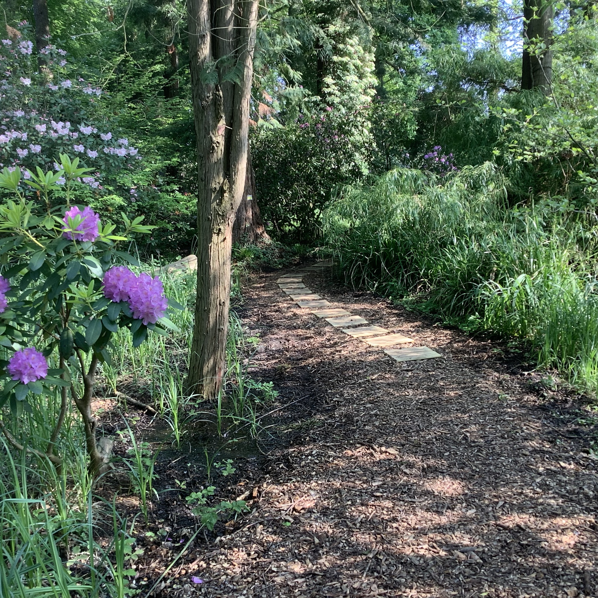 Nur mit Hilfe von viel Häcksel und Trittplatten kommt man auf der anderen Seite der Kull durch, um die Pracht der Rhododendren und der Kletterhortensie zu sehen.