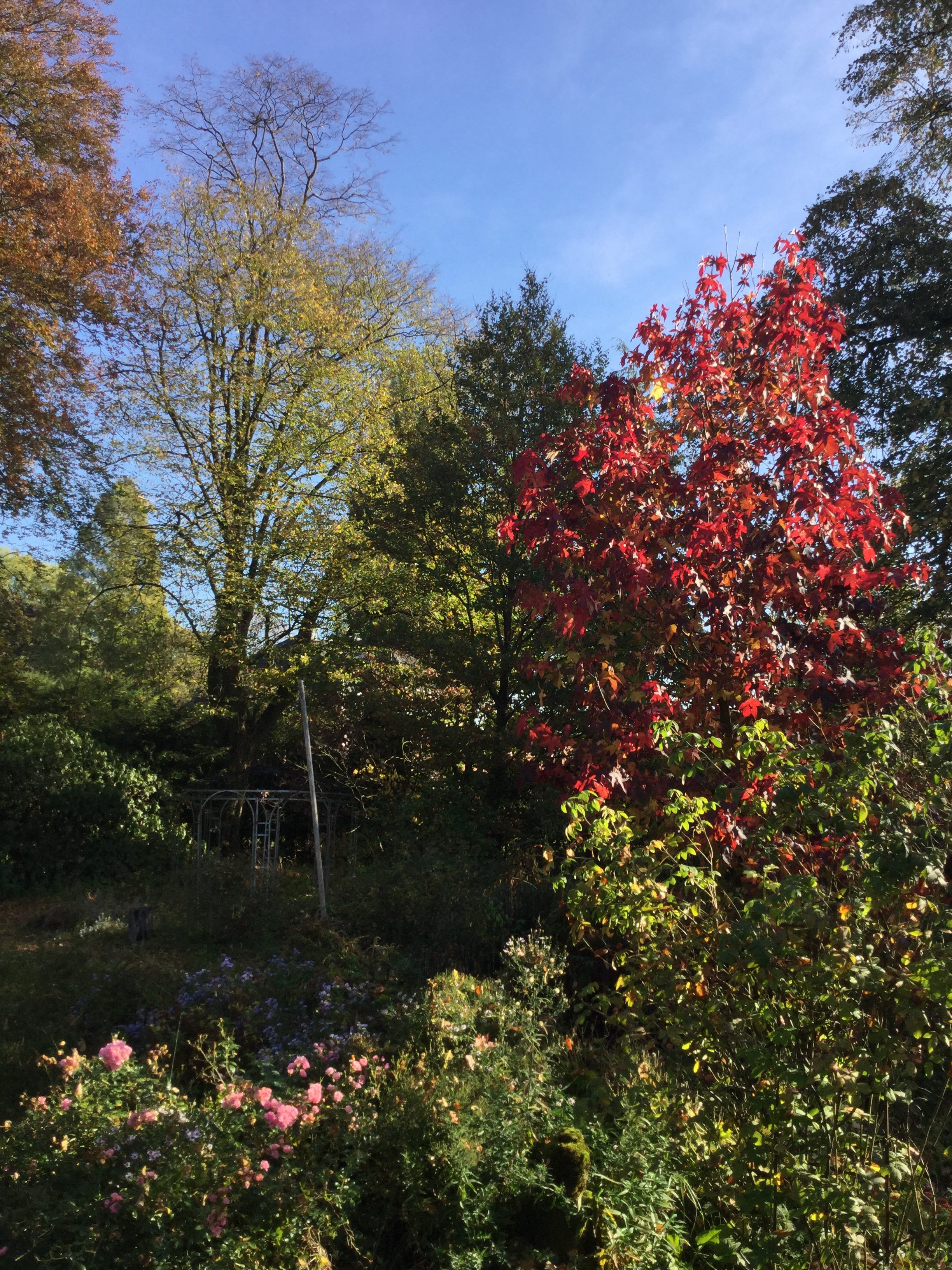 Der Amberbaum / Liquidamber vor unserem Fenster trotzt aller Trockenheit und strahlt in feuerrot und orange. Ein letzter Gruß vor dem Winter.