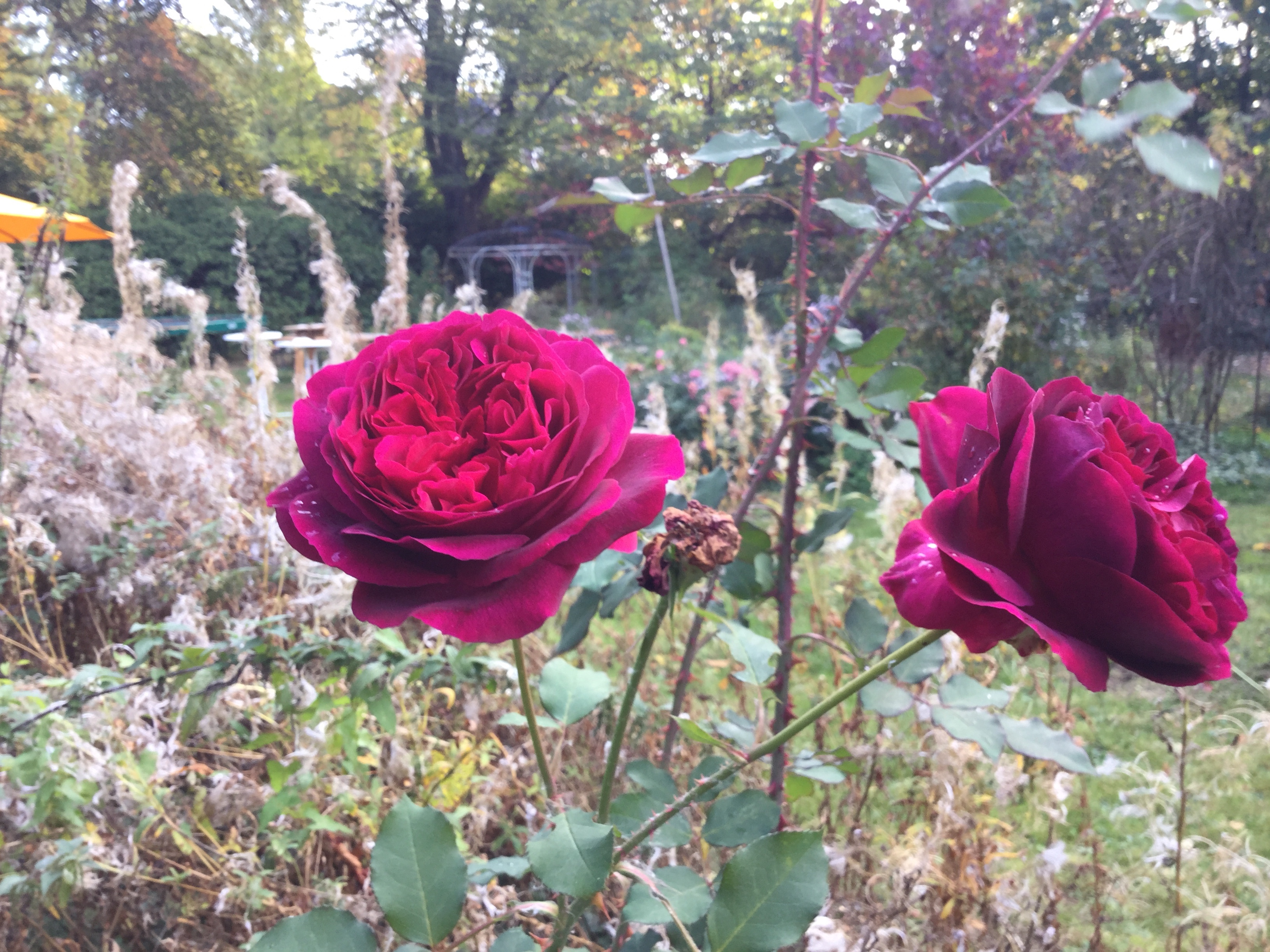 Der lange Sommer bringt neue Blüten. Monsted Wood, eine besonders dunkelrote Rose aus der Austin Züchtung schiebt noch zwei wunderbare, duftende Blüten in den Herbsthimmel.