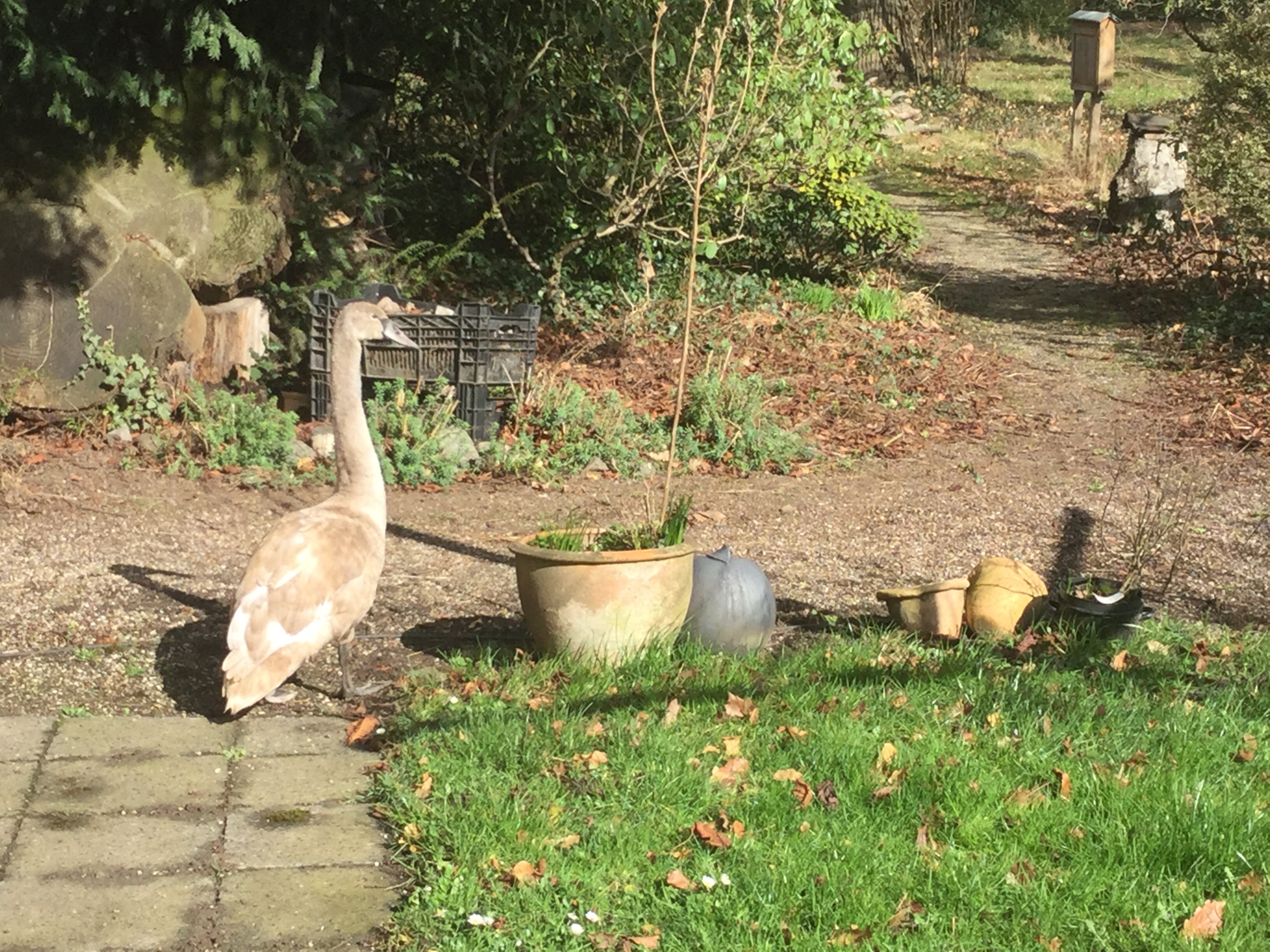 Dieser Junge Schwan folgte mir vom Wasser bis vor die Haustür. Ein Versuch ihn wieder Richtung Wasser zu treiben wurde mit heftigem Fauchen beantwortet.Wo will er also hin?