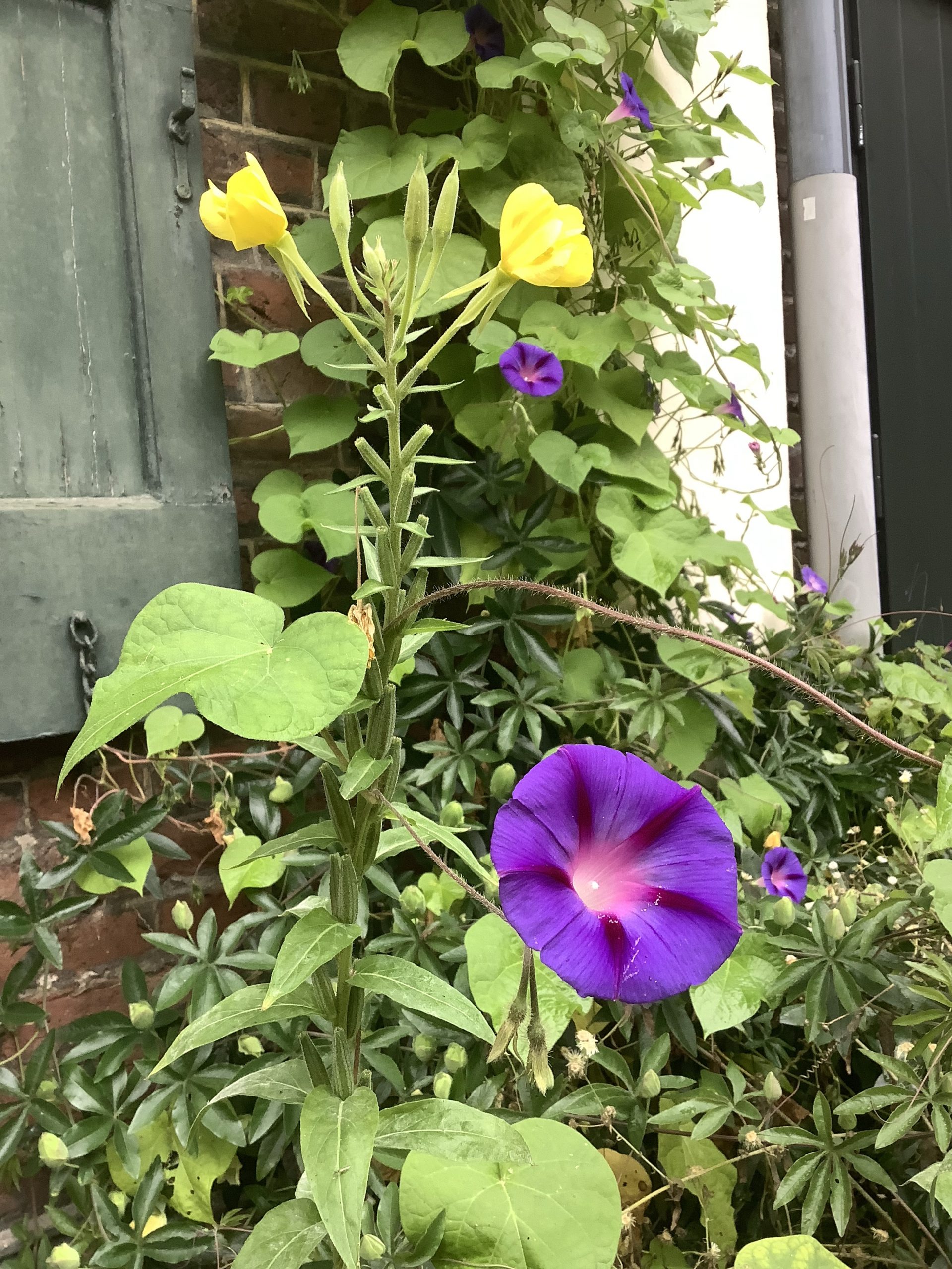 Die eine schließt gerade die duftenden gelben Blüten, und die anderen steht prachtvoll im Morgentau. Am Nachmittag sind die violetten Kelche längst verschlossen.