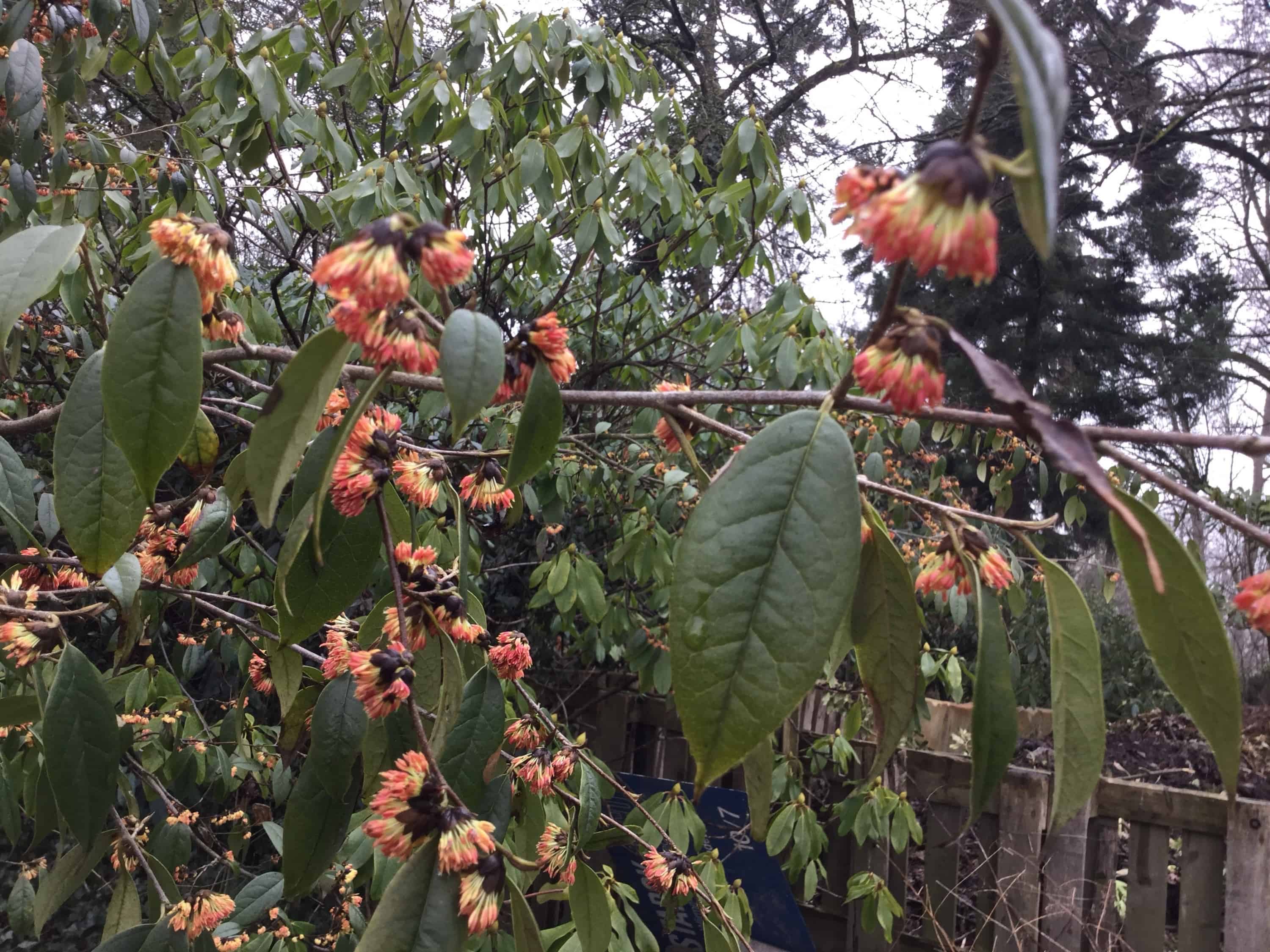 Dieser bezaubernde, seltene Strauch hat keinen deutschen Namen. Er gehört zur Familie der Zaubernussgewächse (Hamamelidaceae), kommt aus China und bezaubert durch seine sehr besonderen Blüten jetzt am Ende des Winters.